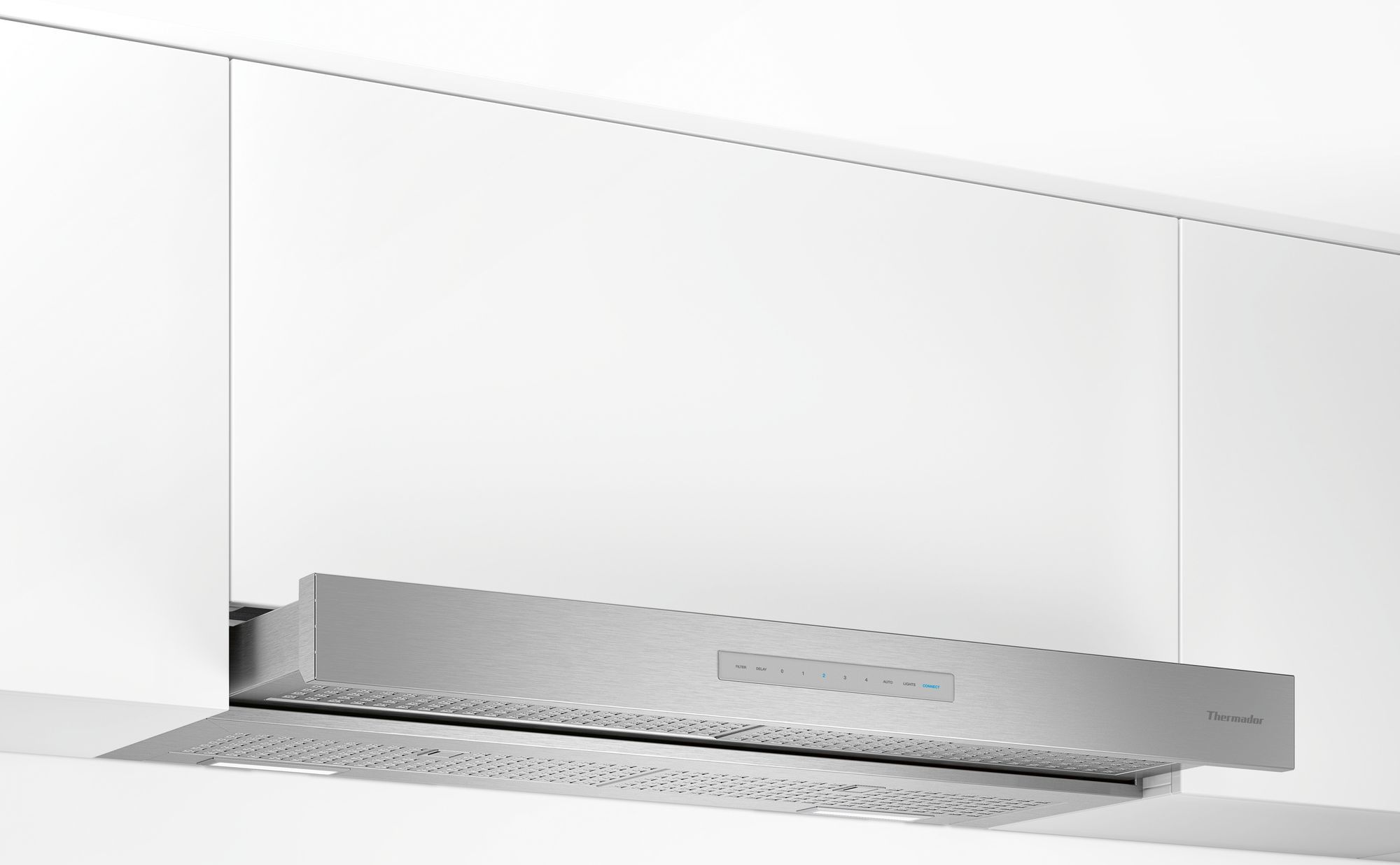 Masterpiece® Drawer hoods blend luxury and performance, featuring a sliding canopy that can be pulled forward or pushed back. Features automatic mode, delay shut-off, and check filter light. Equipped with the Thermador Connected Experience by Home Connect. Cooktop Hood Sync enables control through Freedom® Induction Cooktop.Read More